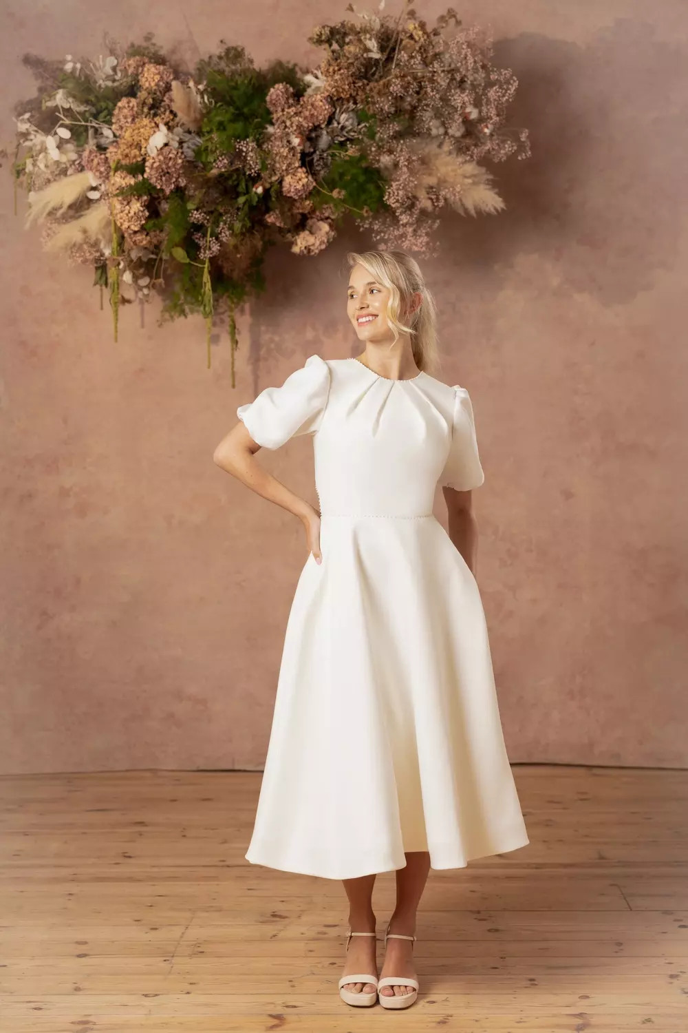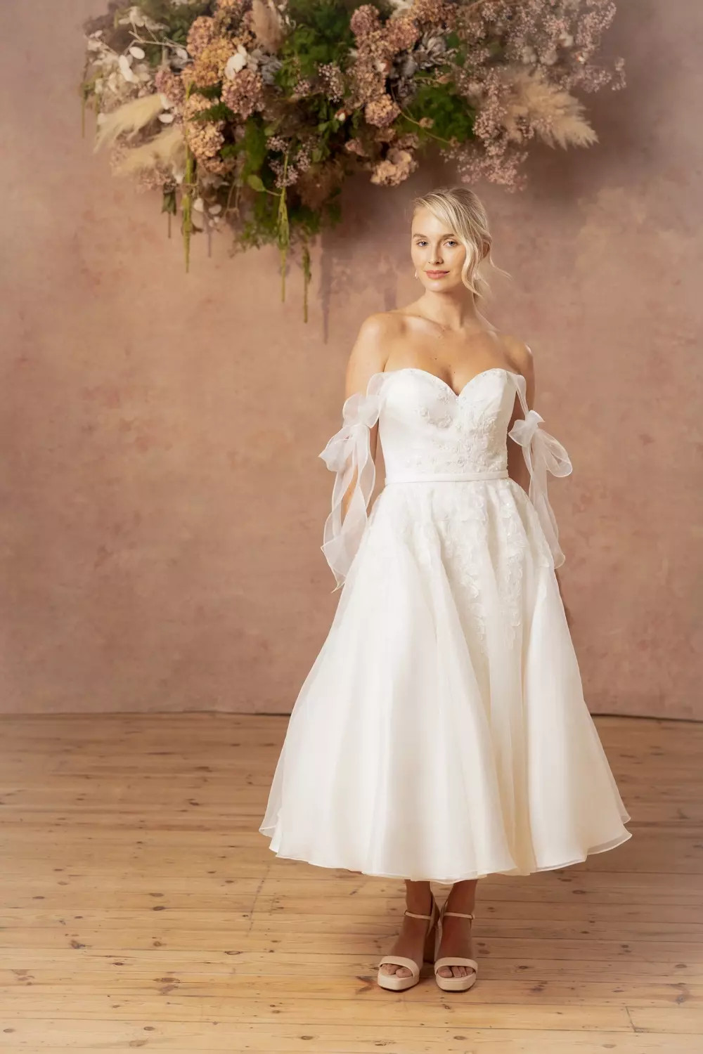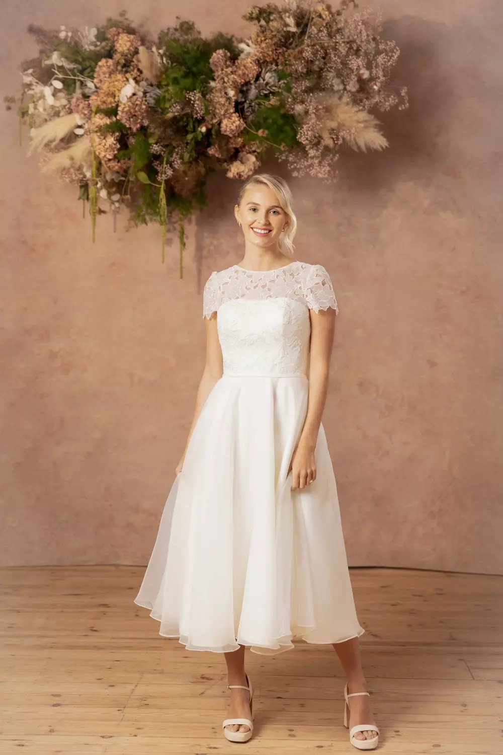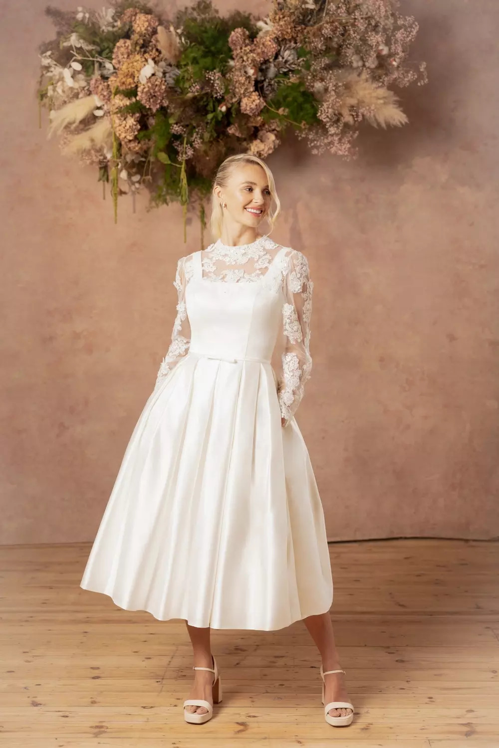 A dedicated collection of sassy tea length wedding dresses with a retro feel. This vintage inspired collection of short bridal gowns features details from the 1950s such as satin collars, sheer sleeves and circular skirts, perfect for dancing in!